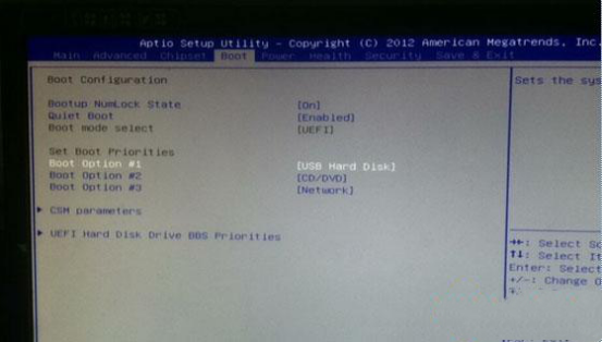 4、BIOS界面三:在Boot下选择Boot Option #1回车选择USB Hard Disk,回车,按F4保存重启。