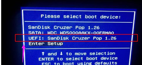 在支持uefi电脑上插入U盘,启动之后不停按F12或F11或Esc等快捷键,不同电脑启动键不同,在弹出的启动项选择框中,选择识别到的U盘选项,如果有带UEFI的启动项,要选择uefi的项,回车从uefi引导
