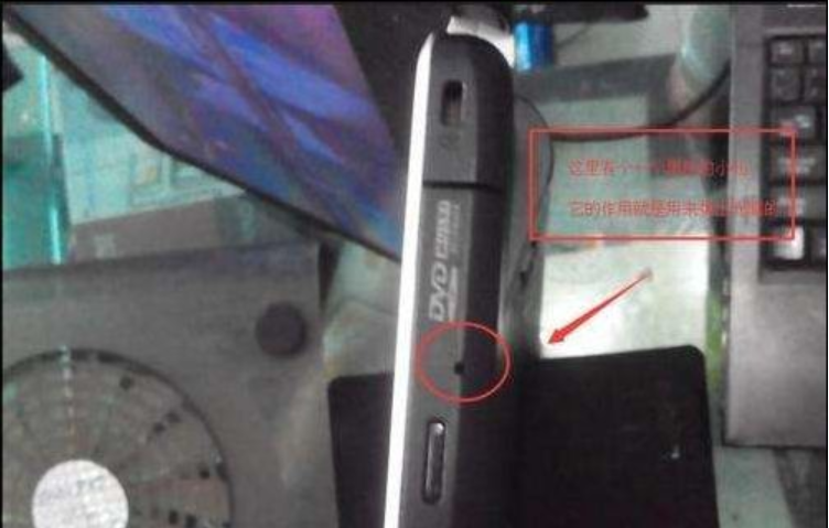 这里还有一种强制开启光驱的方法。每一个光驱硬件都有一个黑色的小孔,这个小孔的作用就是在非通电情况下,采用物理的方法弹出光驱。需要找到光驱旁边的一个小孔,戳一下,即可打开。