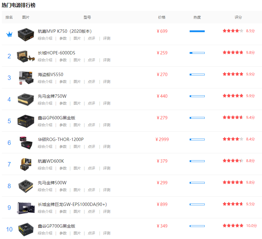 从上图的排行榜中我们可以看出,2021最受欢迎的PC电源是航嘉MVP K750(2020版本),其次是长城HOPE-6000DS以及海盗船VS550.