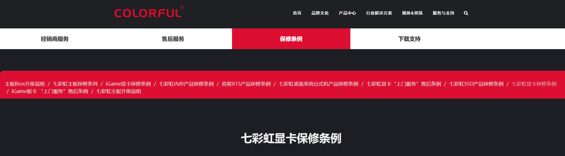 我们进入七彩虹官网点击上方的“服务与支持”,然后点击“保修条例”