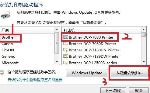 8.选项列表内选着打印机的品牌和型号,如果你有光盘的话就用随机附送的光盘直接安装打印机的驱动系统,如果没有的话,那就到该品牌的官方网站下载这个型号的打印机驱动就行。