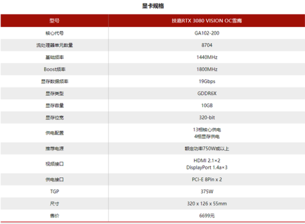 技嘉RTX 3080 VISION OC雪鹰显卡采用了NVIDIA全新的AMPERE架构GA102-200核心,搭载第二代RT Core、第三代 Tensor Core并搭配10GB的高速GDDR6X显存,性能十分强大。