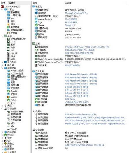 我们再来看一些这款笔记本的详细硬件配置信息。AMD 8核 锐龙7 4800H CPU和6G显存的Nvidia Geforace GTX 1660 Ti GPU都是游戏强劲的保障。