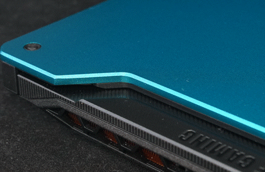 首先我们来看下正面蓝色的金属合金外壳,中间带有这款华硕天选笔记本的品牌logo TX图案。