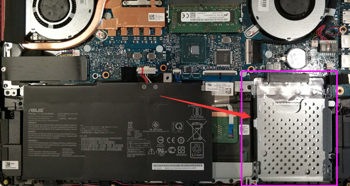3.我们找到机械硬盘位支架,图中红框中的位置是华硕预留的硬盘位。并且有一个金属支架,拆掉几个固定螺丝,取下支架即可。