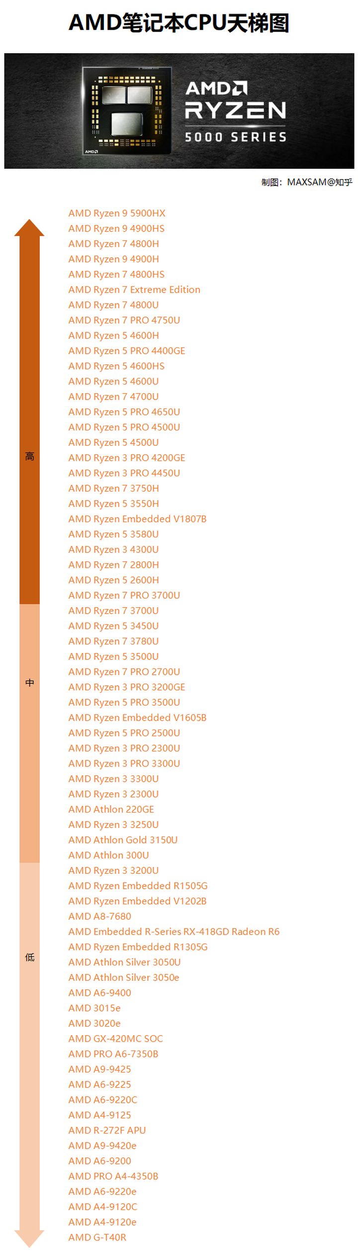 这是最新的笔记本CPU性能排行榜,从多核综合性能看,锐龙4000提高非常多,而且同级别综合性能的笔记本,通常价格只有INTEL笔记本的60%~70%,性价比非常高。综合性能比较适合衡量大规模的运算能力,比如视频剪切等。
