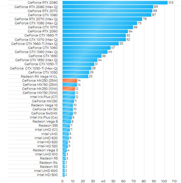 不出所料,Nvidia GeForce mx250显卡性能跑分测试将图形处理器置于较低端,而25瓦和10瓦版本之间的差异并不大。
