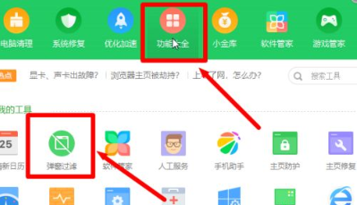 1.首先我们打开【360安全卫士】,点击页面上方【功能大全】,在进入的页面中找到弹窗过滤。