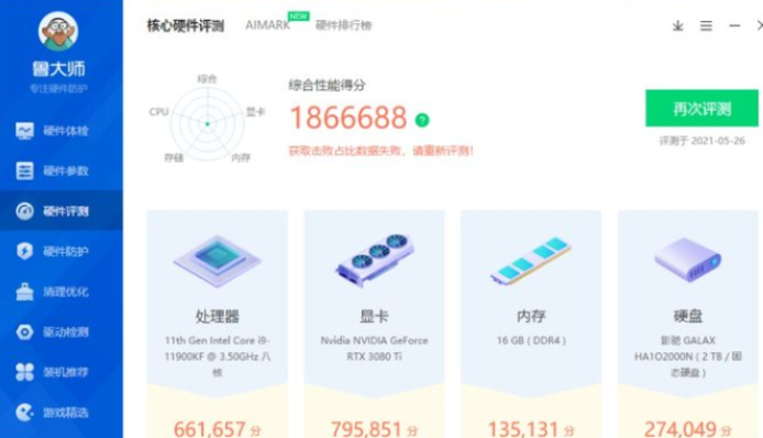 3、我们直接进入测试环节,在鲁大师性能测试当中整机得分为186W分,其中显卡一人独占79.5W分。