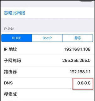 3、先退出后台的AppStore,依次进入【设置】→【无线局域网】找到你的WiFi,点击WiFi名称右边的感叹号,点击进入找到DNS,把DNS数据改成8.8.8.8再开启进入AppStore,看能否正常连接,还是没有解决问题的话,请看下一步。