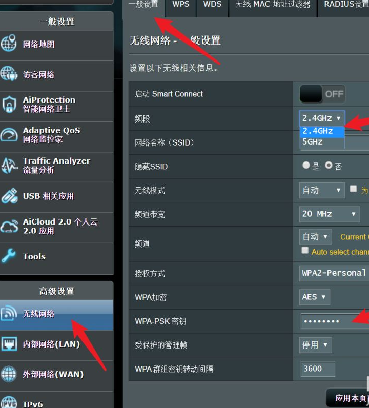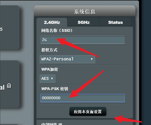 3、以2.4G频段WiFi为例,加密选择WPA2个人版,如,AES协议,点击默认隐藏的密钥,重新输入。点击应用本页设置