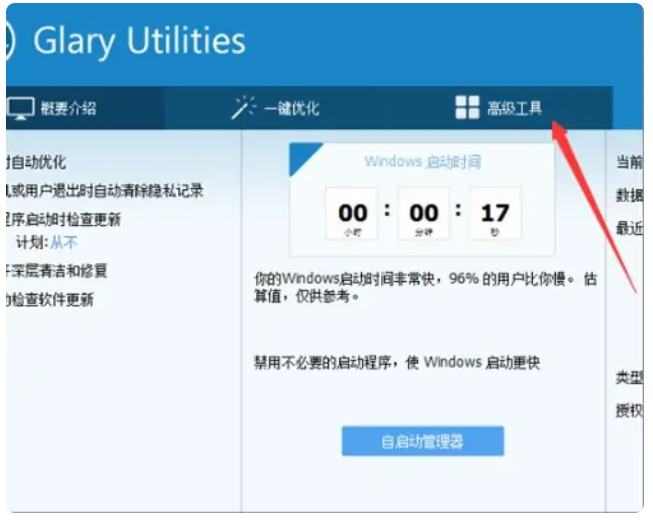 1、第一步,可以使用GlaryUtilities软件对其进行处理。单击主页上的“高级工具”选项,见下图,转到下面的步骤。