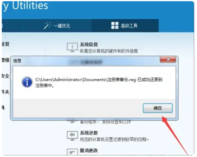 4、第四步,执行完上面的操作之后,等待软件自动还原注册表。几分钟后,软件将弹出并提示注册表已还原,单击“确定”按钮,见下图,转到下面的步骤。