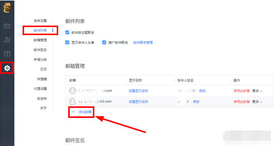 2、接着点击左侧栏的齿轮“图标”进入到“邮件列表”,可以管理当前的邮箱账号,然后直接点击“添加邮箱”选项。