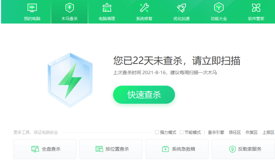 1、打开“360安全卫士”进入主界面,点击上方“木马查杀”直接点击“快速查杀”按钮。