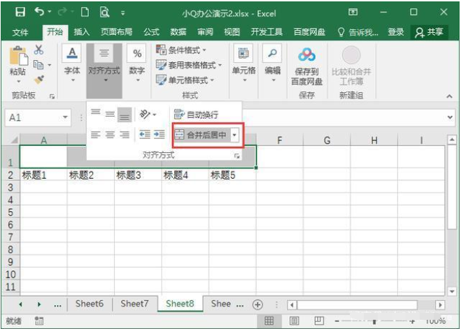 2、如果内容包含标题行的话,可以选中多个单元格,点击开始菜单栏的合并后居中,再输入内容即可。往后的表格中,都可以通过合并单元格的功能,对表格结构进行调整。