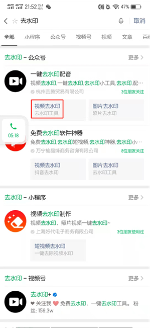 4、在搜索框的界面中,输入去水印,找到一款想要的去水印工具使用,这里小编用一键去水印配音工具。