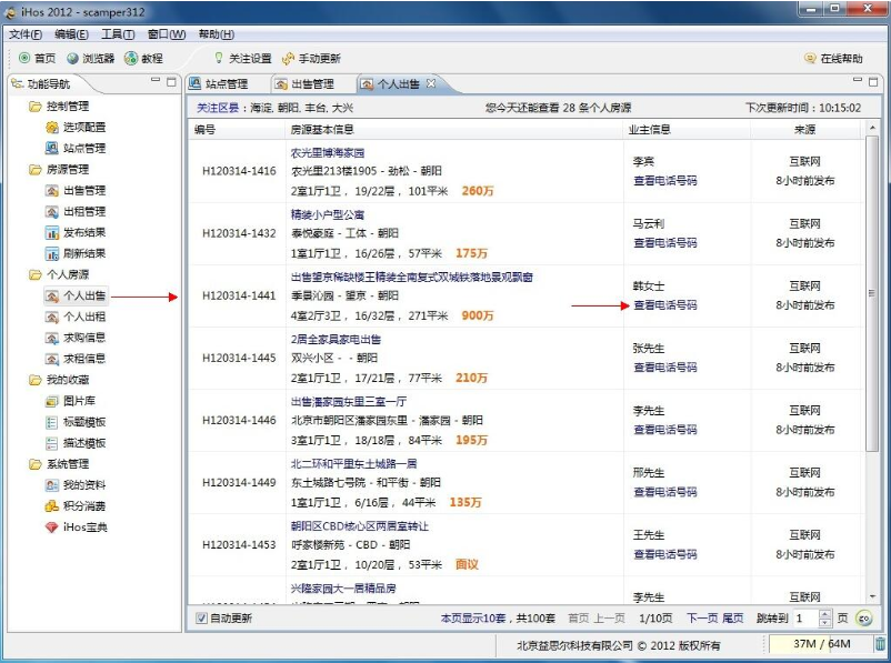 6、或者我们也可以查看个人房源,只需要在功能列表中找到“个人出售”选项,查看房源主人的电话,或者通过搜索分辨真伪房源信息。