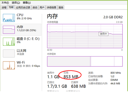 4.再次回到任务管理器中的“性能”选项中查看当前可用内存情况即可。