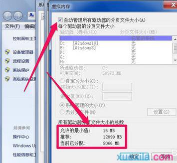 5 进入虚拟内存设置界面,当前为系统托管,那个“自动管理所有驱动器的分页文件大小”是被勾选的,当前分配是8066MB,推荐是12099MB。