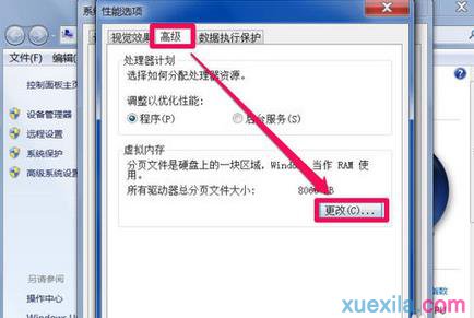 4 在性能选项窗口,同样选择“高级”这个选项卡,并在其界面中,点击“虚拟内存”下的“更改”按钮。