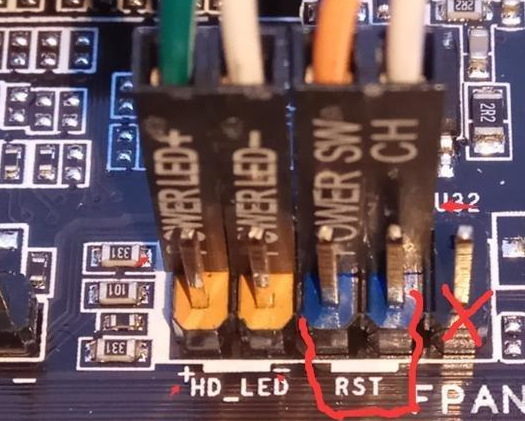 方法很简单,主板上会有与连接线同样的标注,彩色的线为正极,白色的线为负极,负极一般靠右边。如下图所示,按照主板的跳线标注,对应插入。
