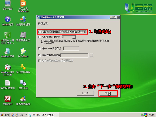 继续下一个窗口,此时我们勾选第一个默认选项“将目标系统的盘符排列顺序与当前系统一致”,然后再点“下一步”按钮继续,如下图: