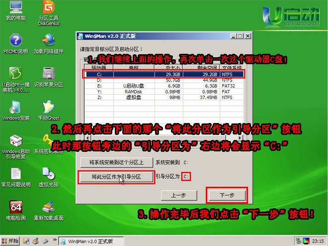 我们继续上面的操作,用鼠标单击驱动器“C盘”,然后点击“将此分区作为引导分区”按钮,此时旁边的“引导分区为”右边将会显示“C:”,都操作完毕后我们点击“下一步”按钮继续,如下图: