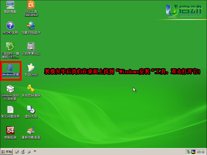 现在,我们在桌面上找到“Windows安装”工具,然后双击鼠标打开该工具,准备开始加载原版系统镜像到C盘!如下图: