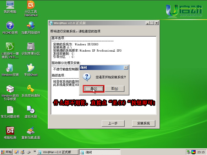 点击了“安装系统”按钮后将会弹出一个询问小窗口,我们只要点击“是(Y)”按钮即可,如下图: