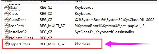 接着还是在注册表刚刚的位置新建我们刚刚删除的项新建添加“多字符串值UpperFilters"项,修改内容为kbdclass。重启设备就会发现可以使用键盘了,