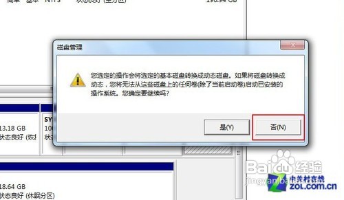 需要注意的是,如果在最后一个新建分区时出现这个对话框提示,一定要选择否,不然你的硬盘就悲剧了。解决方法是利用硬盘管理软件将这个分区转换为逻辑分区,这样就不会出现基本磁盘转换成动态磁盘的提示。切记,动态磁盘不适于一般用户使用,请勿转换!