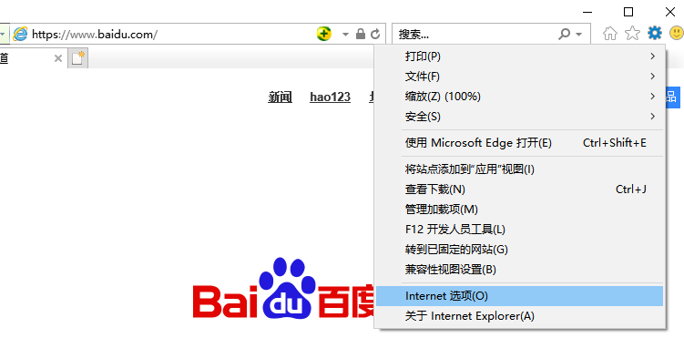 1.小编这里以ie8浏览器为例说明,打开ie浏览器,点界面右上角的齿轮按钮,在下拉框中选择Internet选项打开。