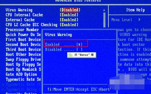 操作方法:以Virus Warning:病毒报警选项设置为例。选择好后,回车