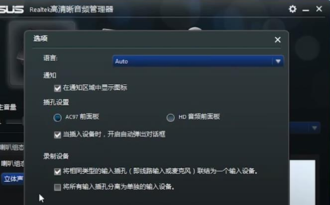 3.接着首先双击点击“选项”,在“插孔设置”下方的选项中上点击“AC97”前面板,点击确定即可。