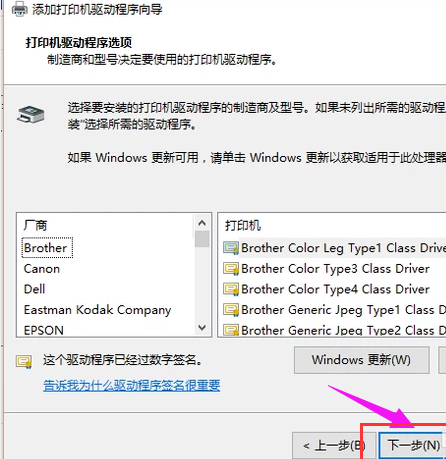 6、选择要安装的打印机驱动的制造商和型号,下一步