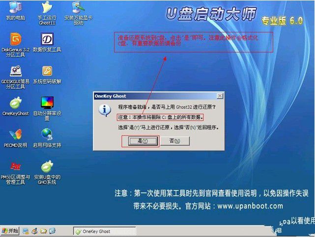 第六步:提示程序准备就绪,准备还原系统。此操作需要注意会对C盘进行格式化,有重要数据请备份