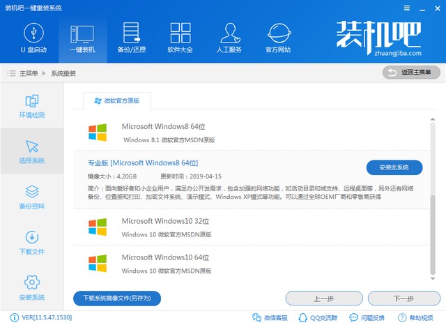 3、装机吧功能界面有U盘启动,一键装机,备份/还原等功能,有时间大家可以自己摸索一下,这里我们直接点击系统重装。