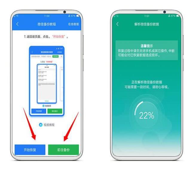 接下来根据系统的要求,我们进行备份,等待备份完成后我们选择开始恢复选项并进入解析环节,之后解析完成重启微信即可!