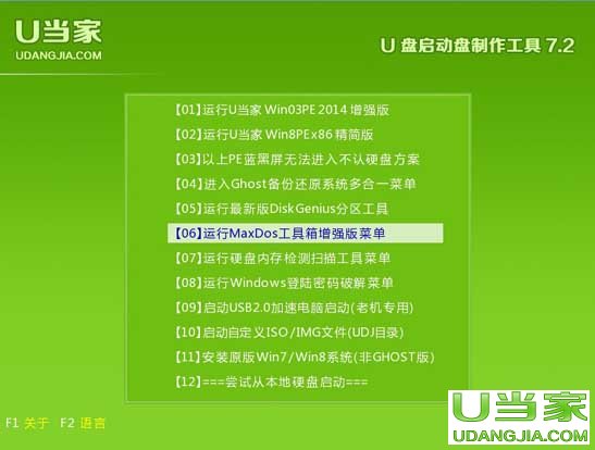 7、进入U当家启动界面后,选择第六项(运行MaxDos工具箱增强版菜单)如下图所示: