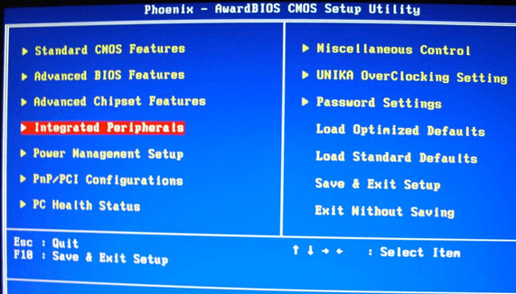 1.开机等待屏幕出现开机画面的时候,按“Delete”进入BIOS设置界面,然后在BIOS设置界面中选择“Intrgratedted Peripherals”回车确认。如下图所示