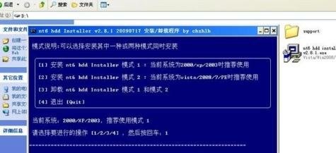 下载后放到之前存放win7安装文件的盘符的根目录,也就是和win7的安装文件放到一起。然后运行,会出现下面的窗口,如果您现在的系统是XP可以选择1,如果是vista或者win7选择2,大家看一下就能明白,选择后按回车开始安装,1秒钟左右结束,之后就是重启系统了
