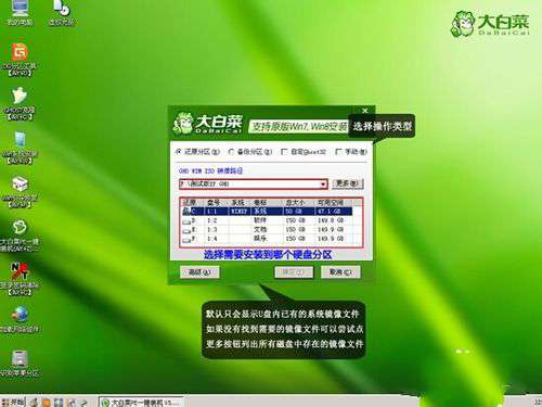 进入系统,界面”毫无违和感“对吗?莫慌!马上双击”大白菜PE一键装机“(在途中第6个图标),上面会帮你自动选中”还原分区“,你要做的是选对你要安装的系统文件的路径,(一般它会自动帮你找到,你确认下就行了)后缀名没记错是”.GHO“。然后选择把系统装到哪个盘里(其实它都会默认帮你选第一个盘),是不是很人(傻)性(瓜)化(式)呢!?
