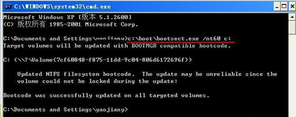 1、在XP系统中点击开始→运行,填入CMD命令然后按回车,在命令行窗口键入,c:\boot\bootsect.exe /nt60 c: 命令并按回车。