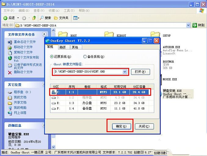 2、运行“硬盘安装.EXE”安装器就会出现下面的界面,一般情况下默认就可以了,然后点“确定”。