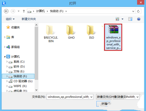 在打开窗口左侧列表中点击u盘,选择保存在里面的原版xp系统安装包,继续点击“打开”按钮,如下图所示: