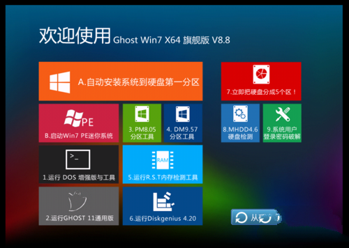 安装64位系统,选择"A.自动安装系统到硬盘第一分区",使用ghost方式安装不需要过多自定义设置。