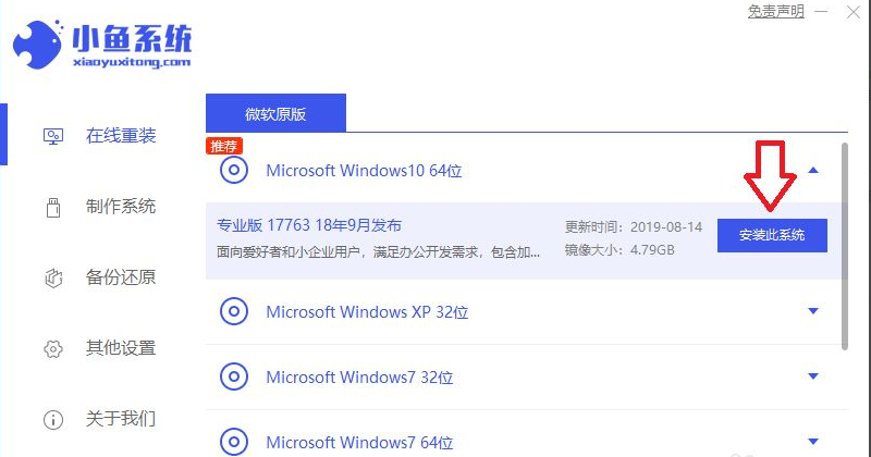 1.在需要升级win10系统的电脑上打开【小鱼一键重装系统】工具,点开需要重装的win10系统,点击 安装此系统。