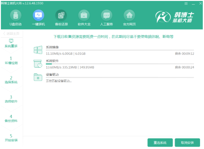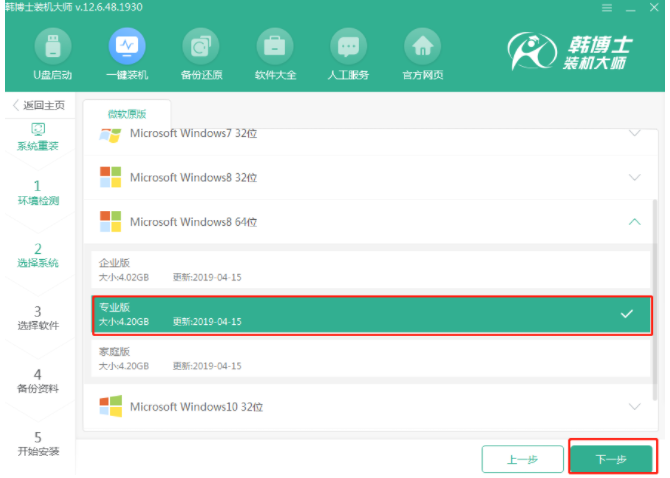 当你关掉所有杀毒软件时,在韩博士界面中选择“重新启动”。等待韩博士检测到计算机配置信息后进入“下一步”操作,根据自己需要选择win8系统文件开始“下一步”操作。